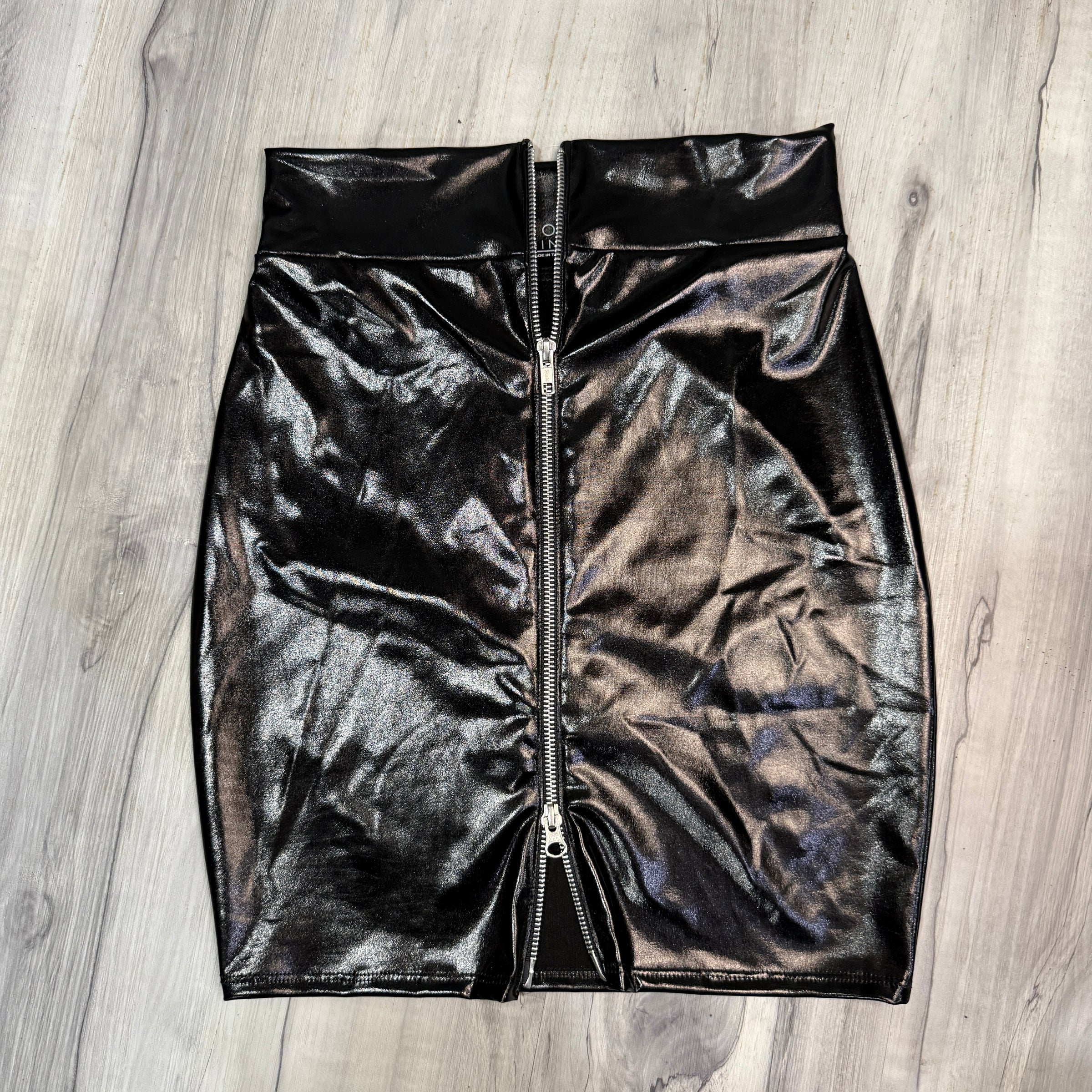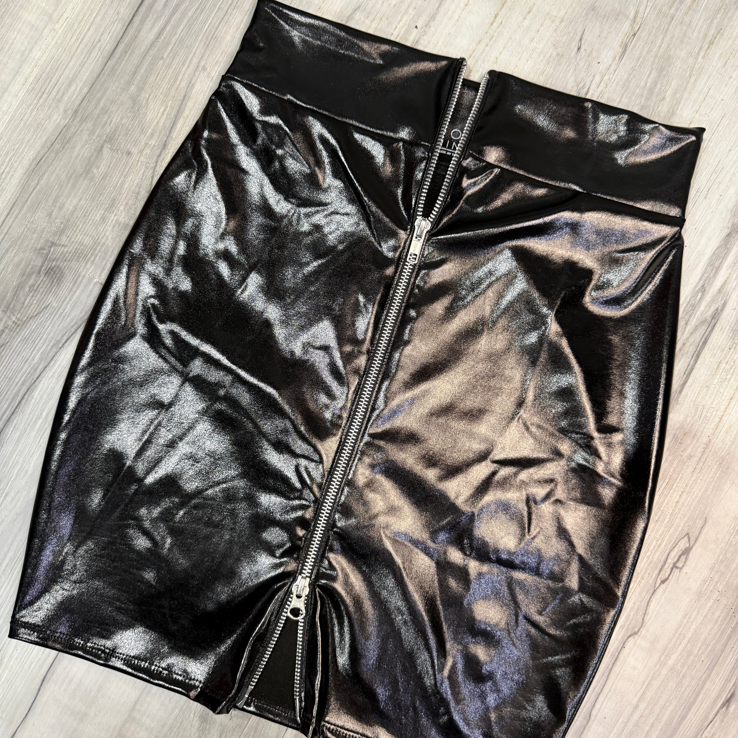 Zipper Pencil Skirt - Black Metallic "Wet Look" Faux Leather