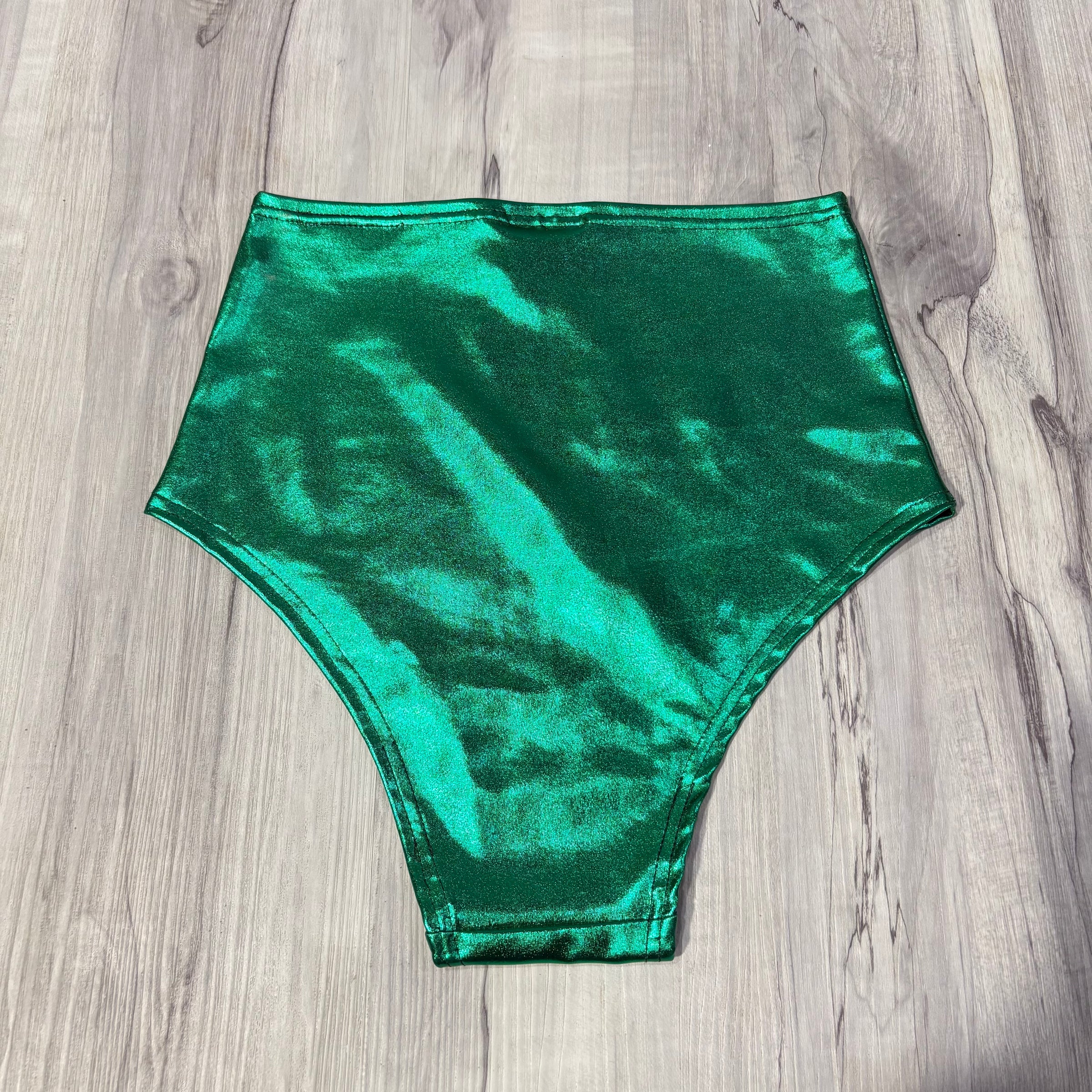 These panty cheeky hot pant booty shorts are made of stretchy green metallic spandex and sit high on your natural waist. Wear as a bikini bathing suit bottom (but don't expose to chlorine or saltwater) or to compliment your rave outfit. They have a built in liner and are made to be flattering to your figure.