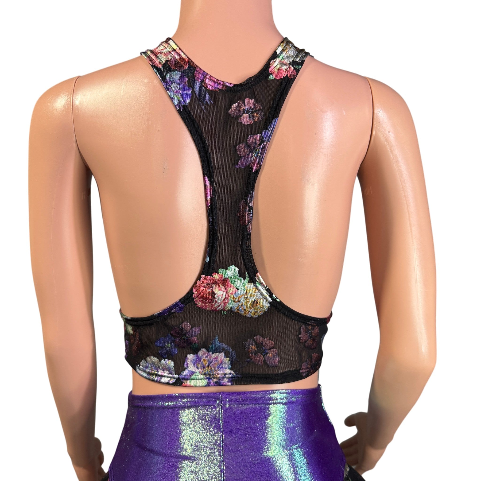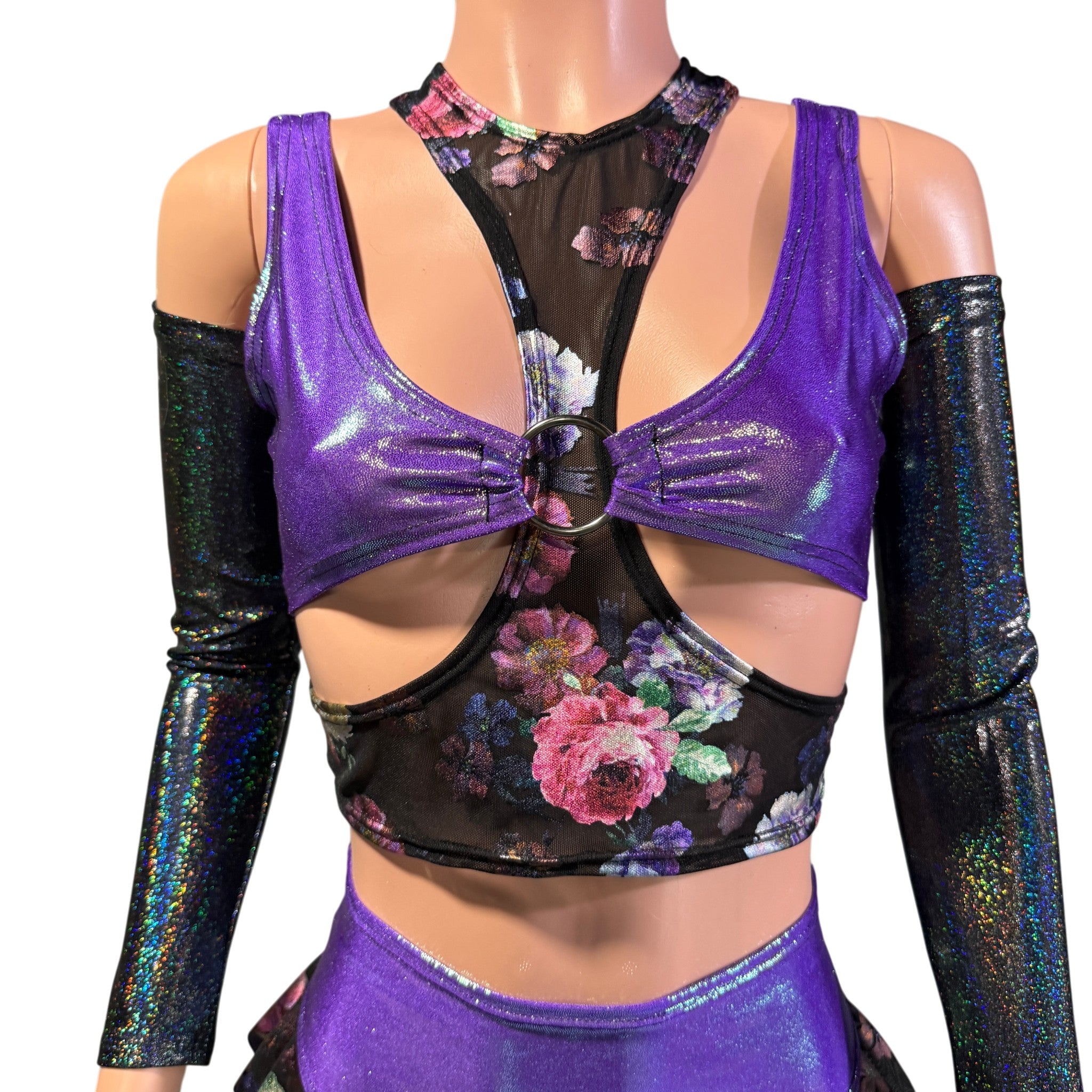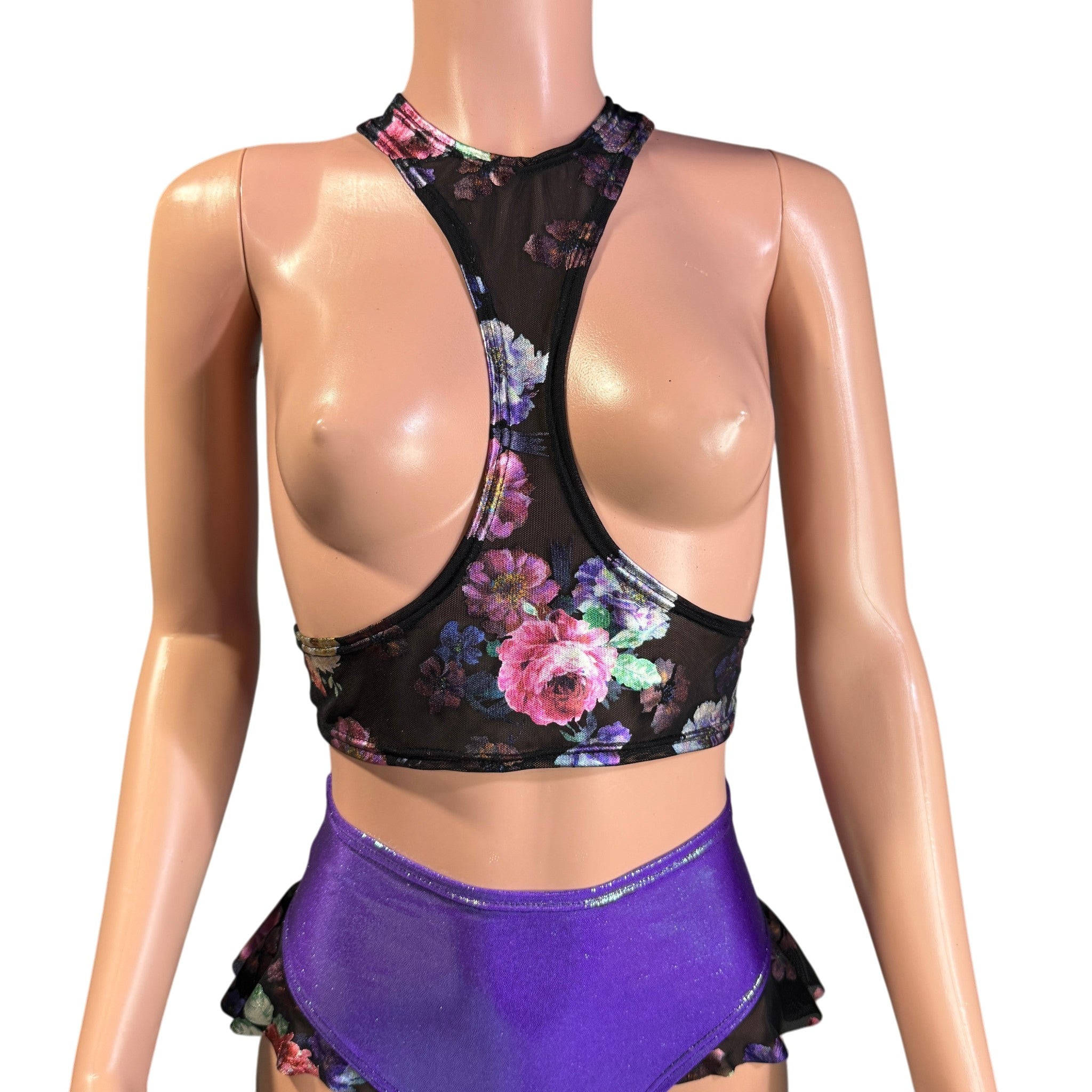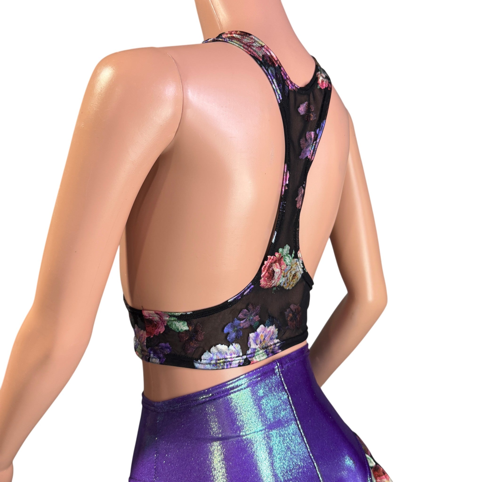 Made from a sheer floral mesh, this piece features a sleek high neckline and racerback cut, with a front cutout detail that adds just the right amount of edge. It’s the perfect layering piece to pair with holographic sets, bodysuits, or rave tops.