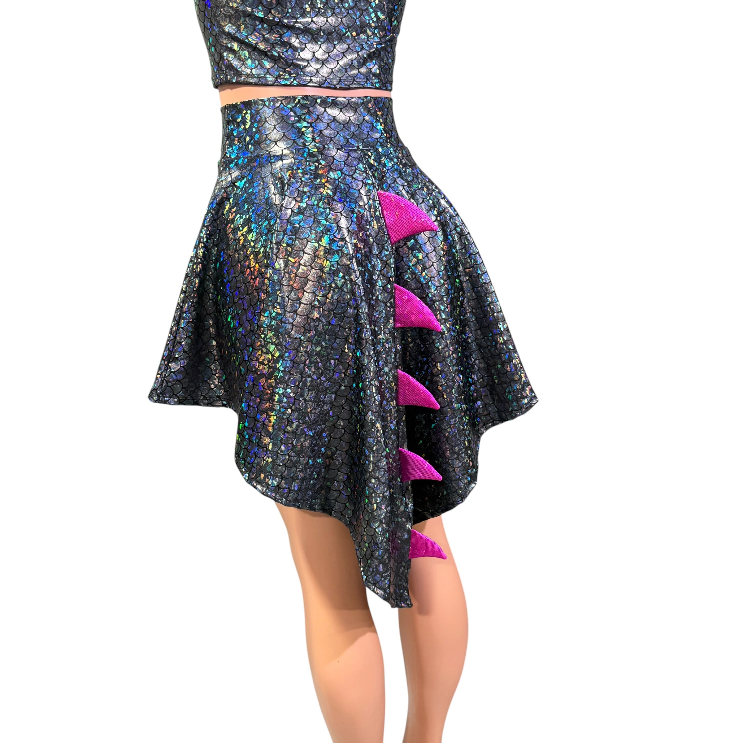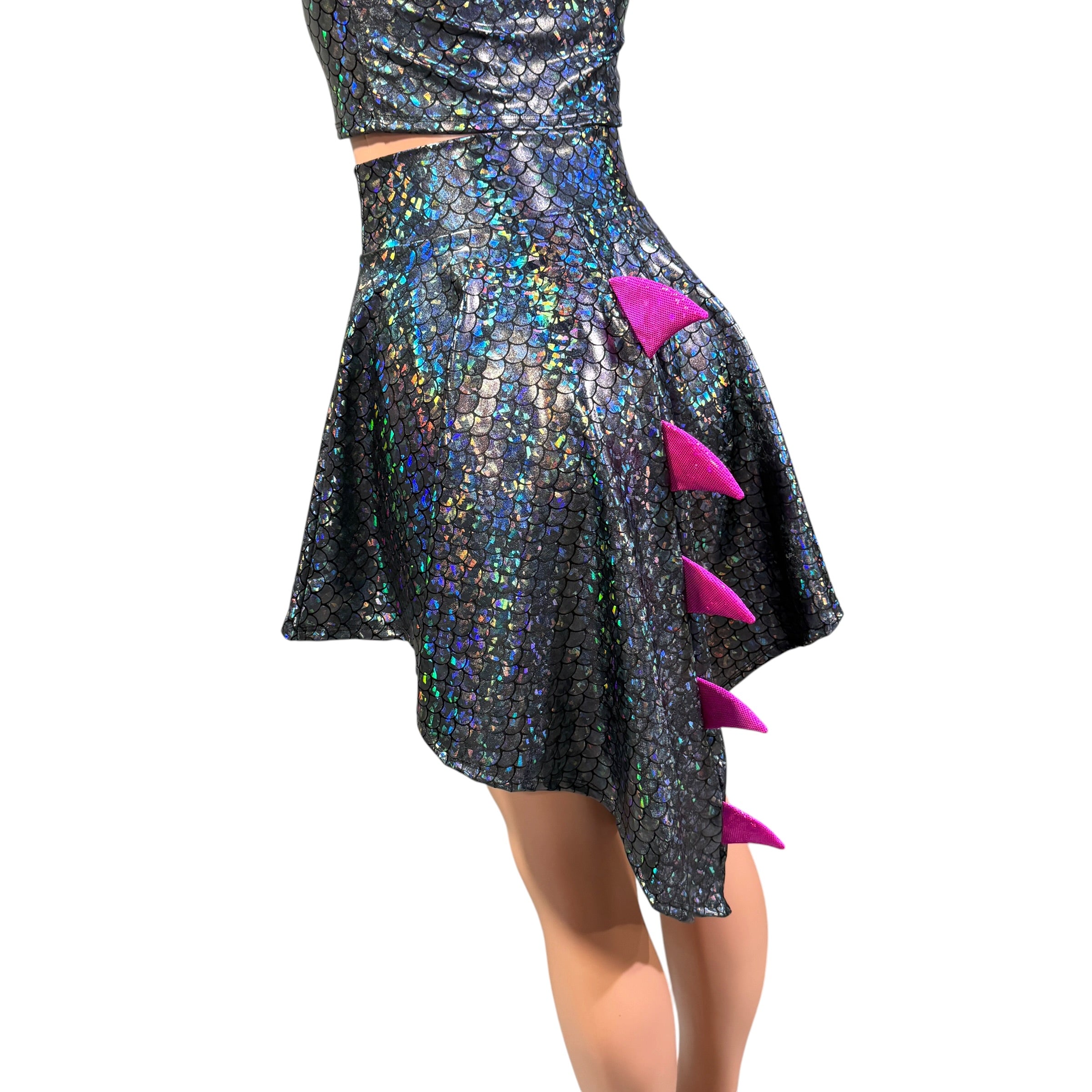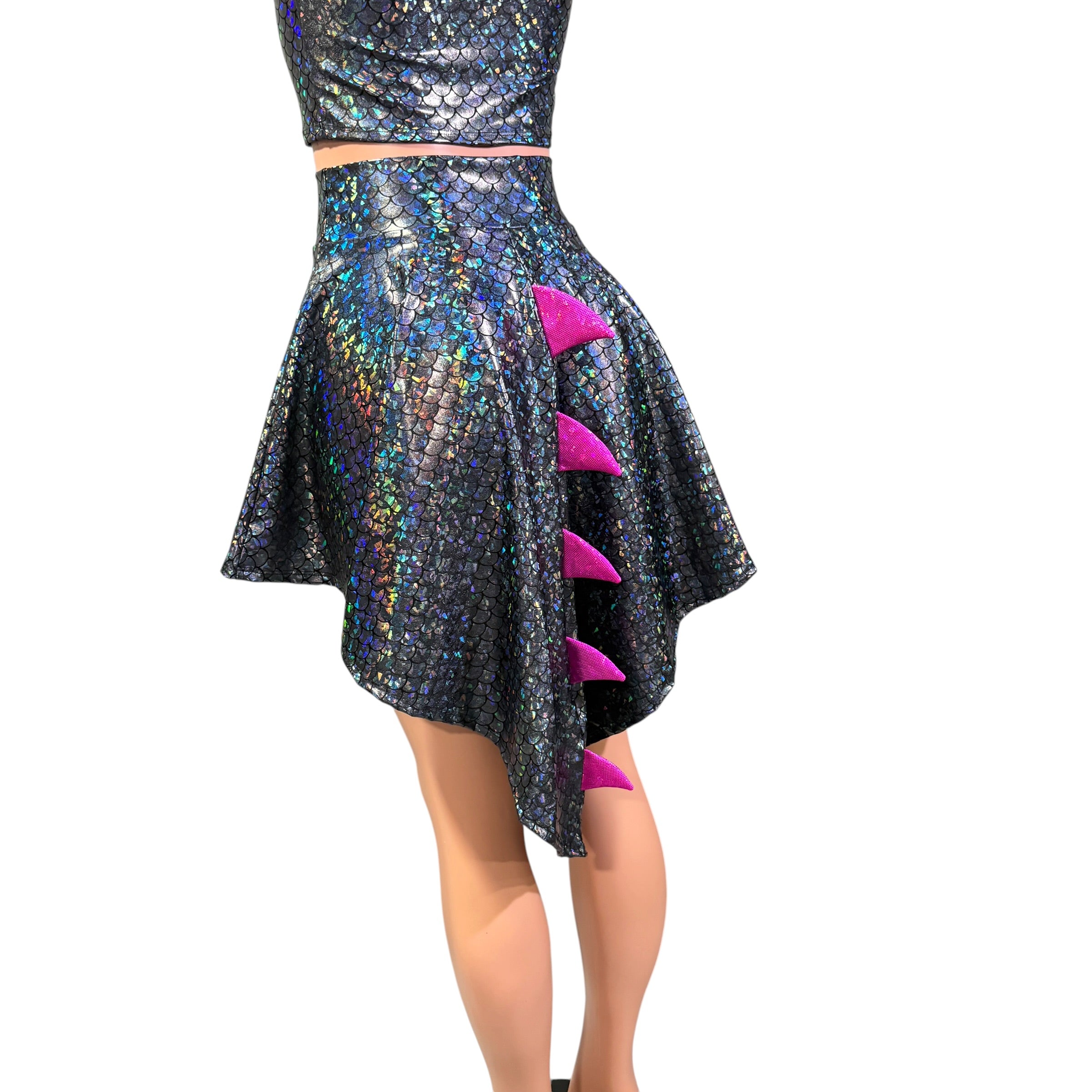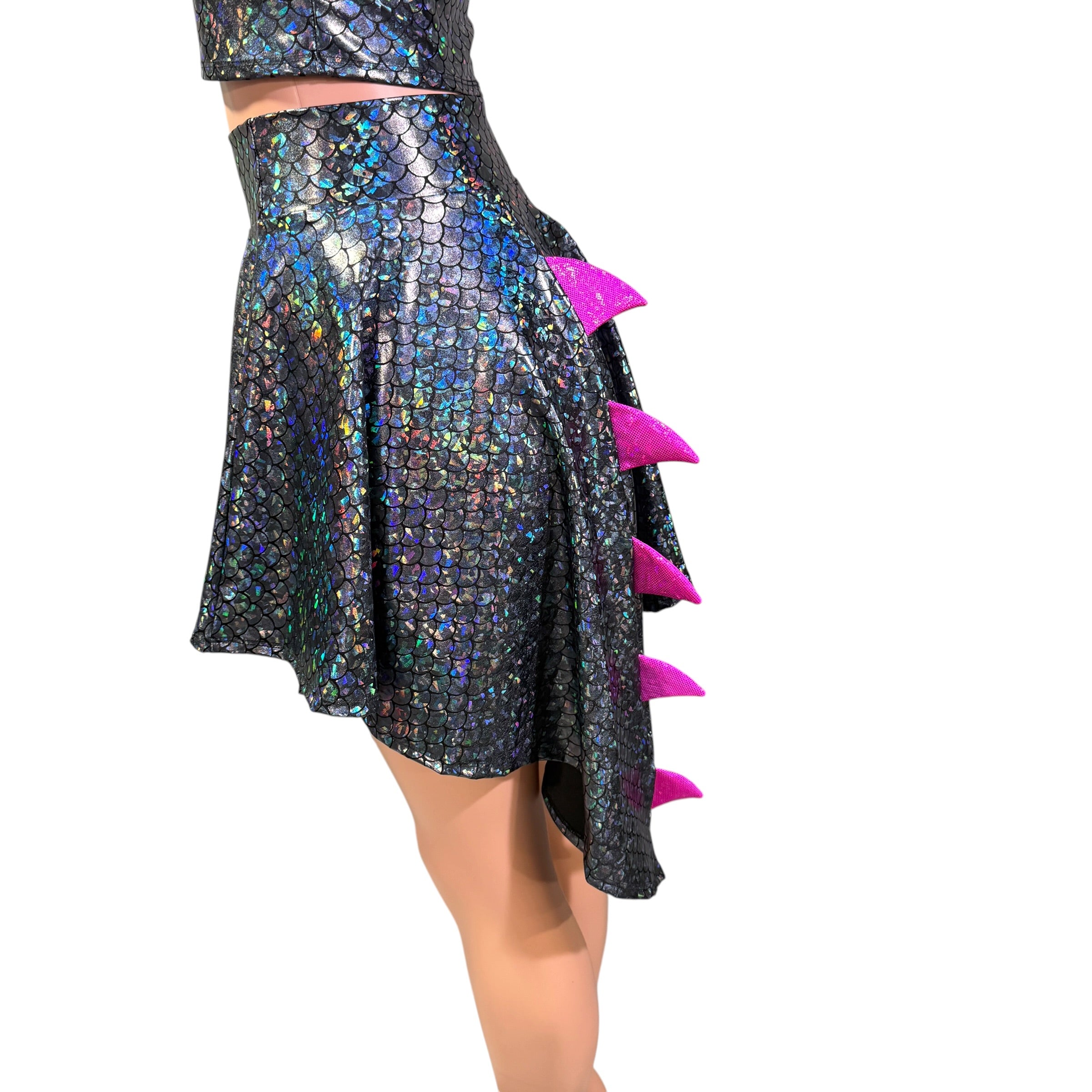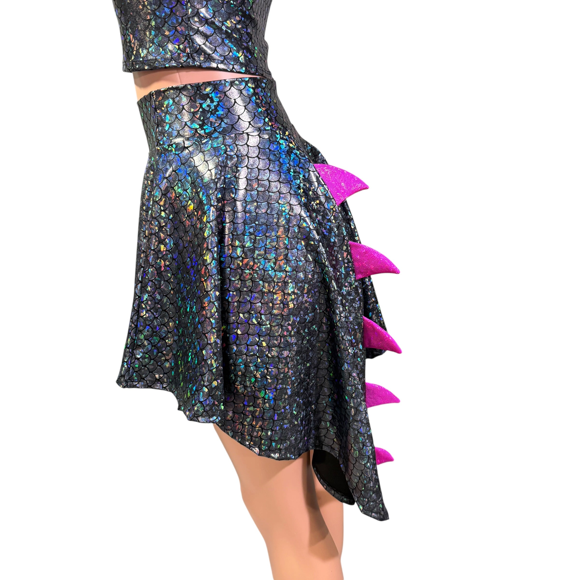 Channel fierce, otherworldly energy in this dragon-inspired skater skirt, featuring shimmering holographic scales and bold spike detailing down the back.