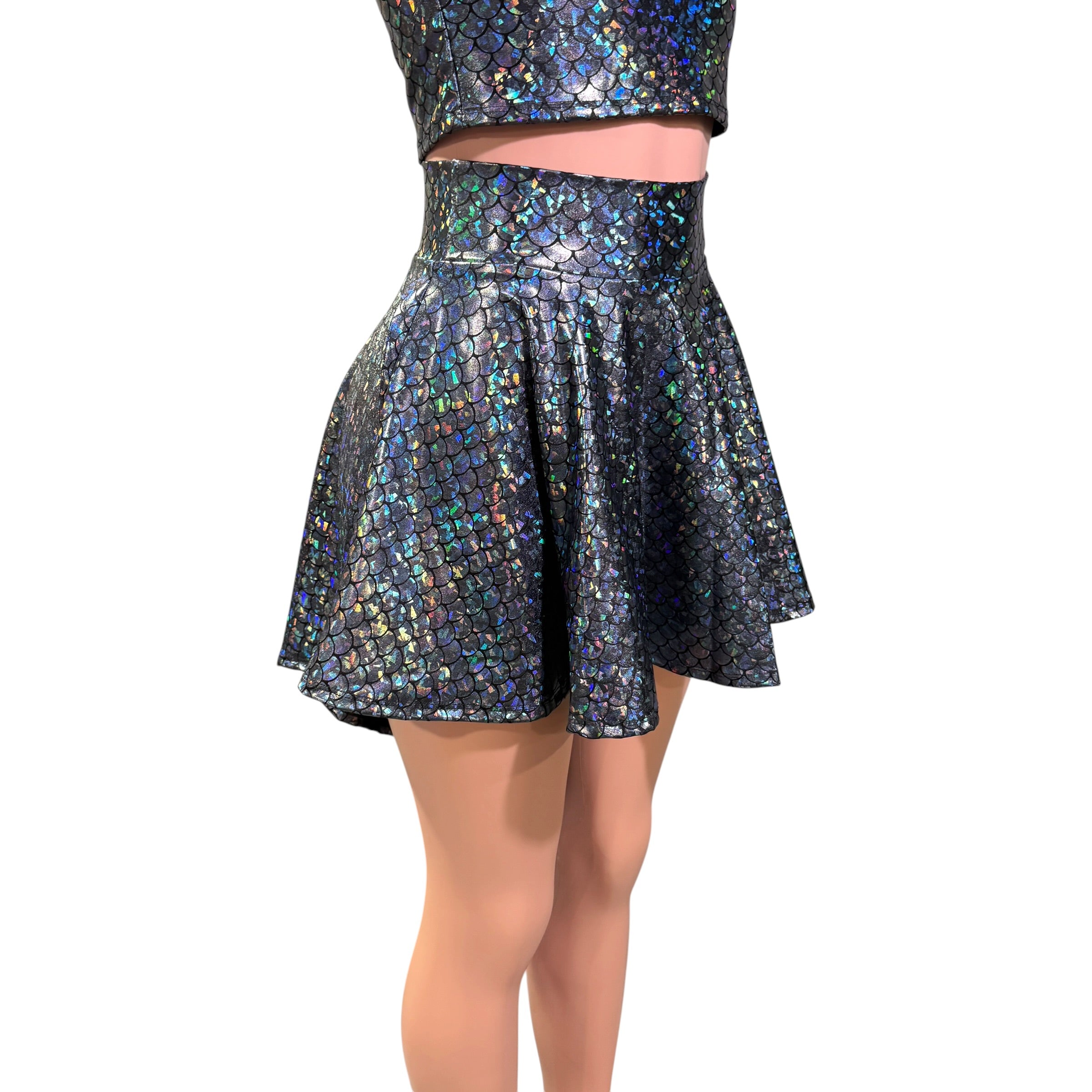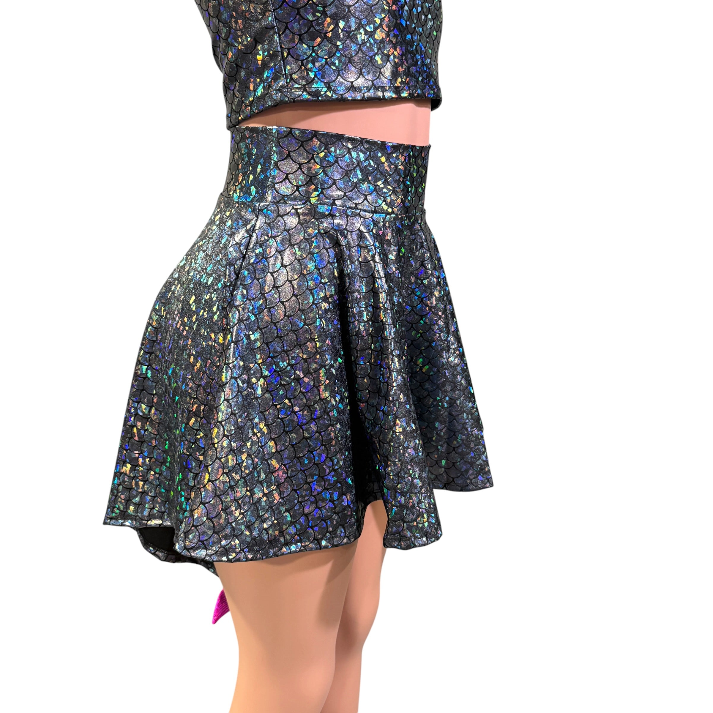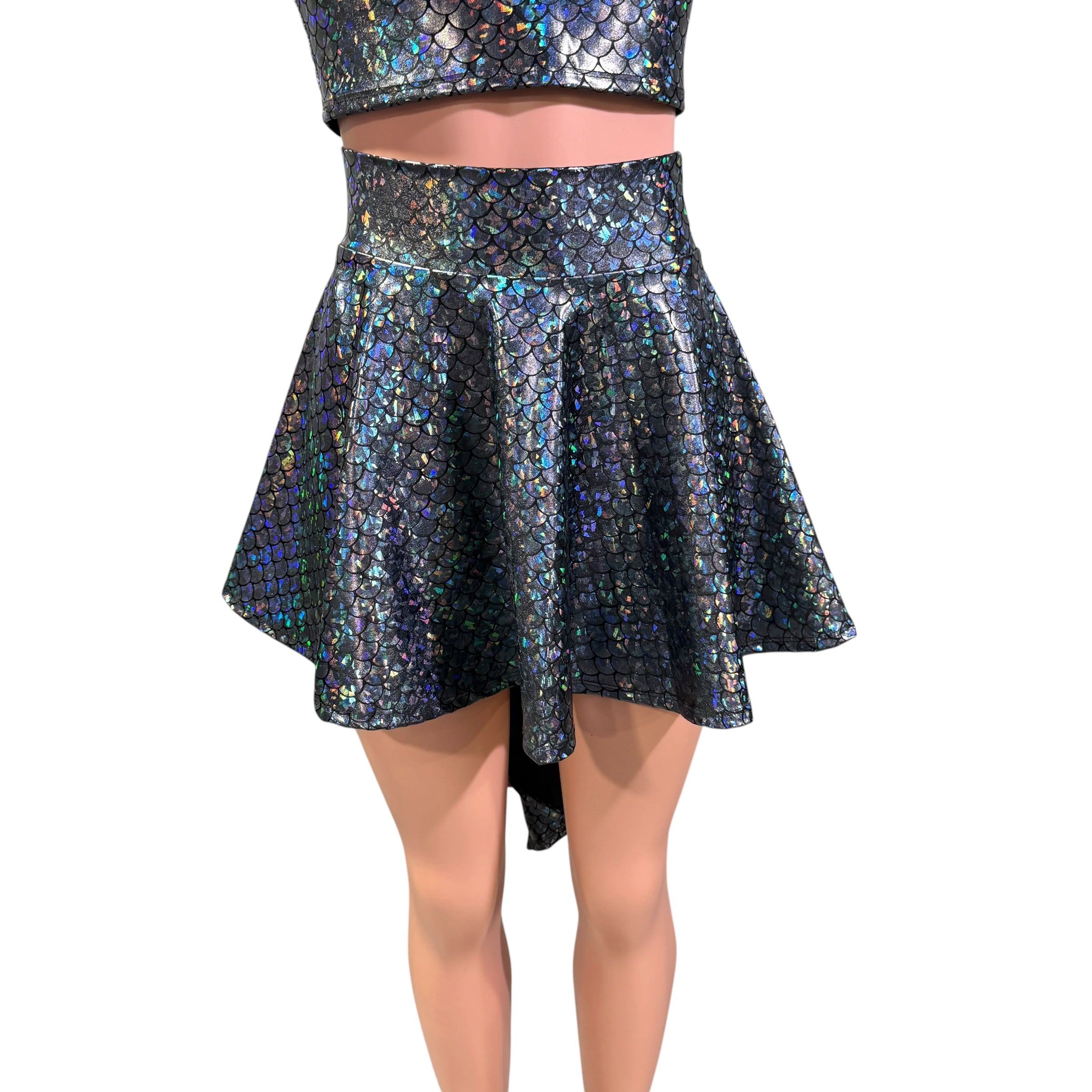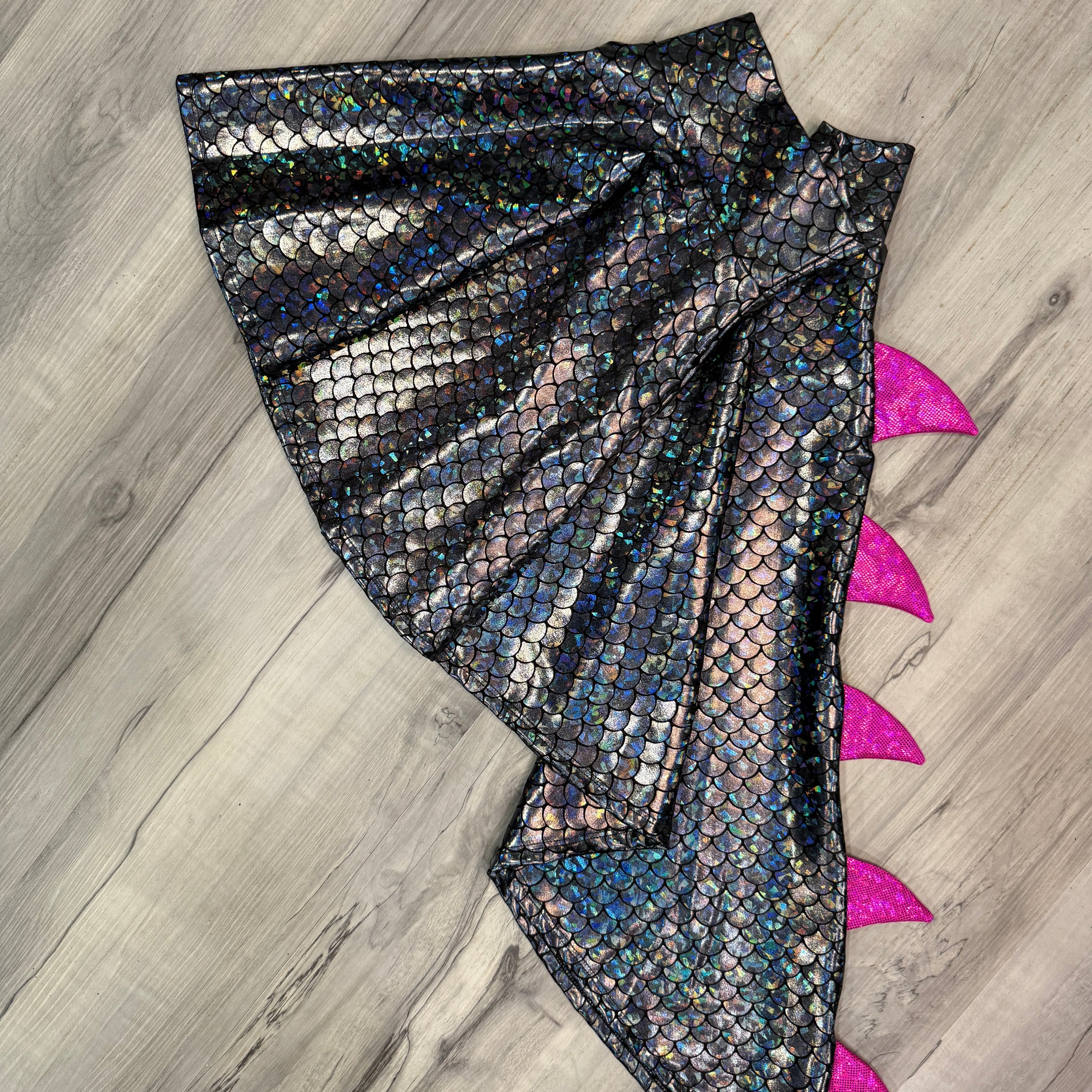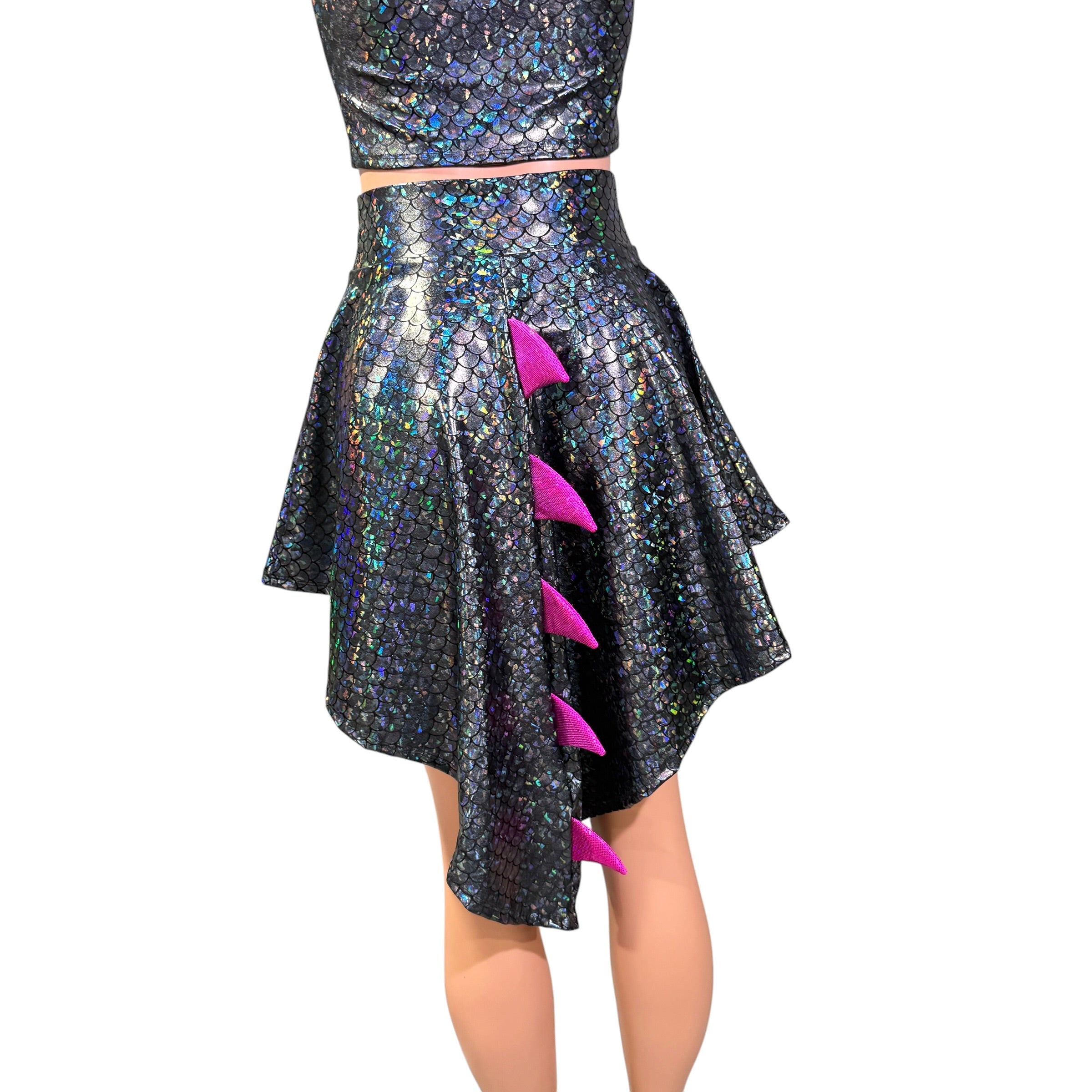 Channel fierce, otherworldly energy in this dragon-inspired skater skirt, featuring shimmering holographic scales and bold spike detailing down the back.