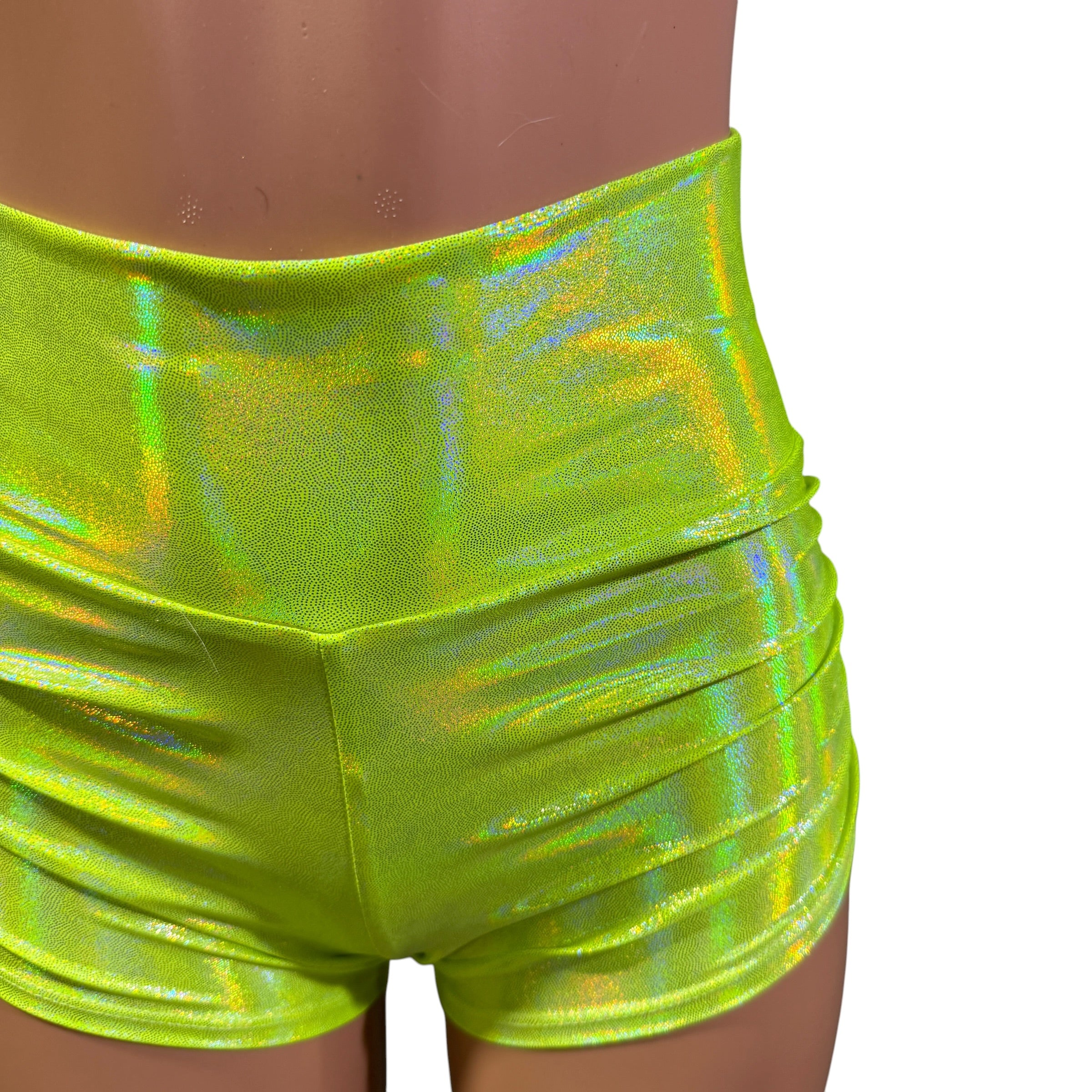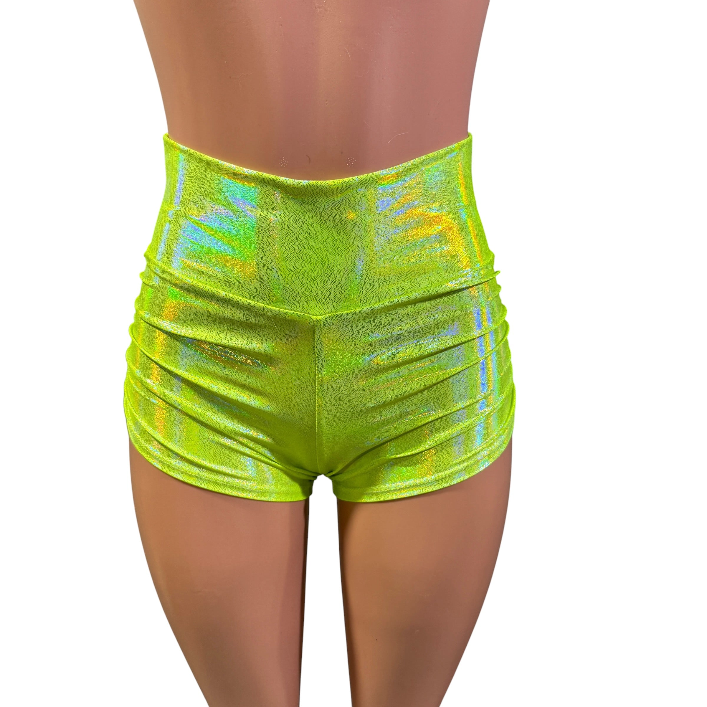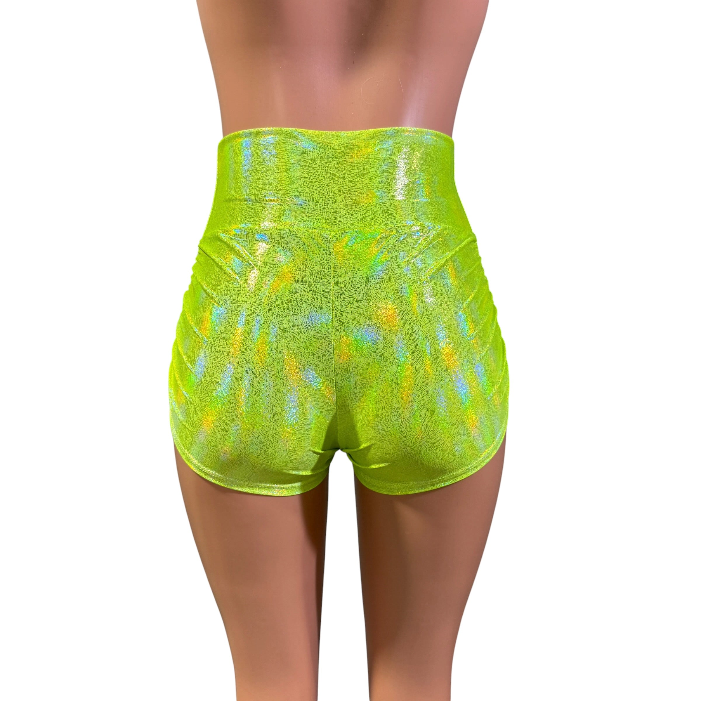 Sexier and more flattering! Our classic scrunch booty shorts made in neon lime green holographic performance spandex with ruching on each side. Made to flatter your figure and move with you. The standard inseam is 2.5" - but can be customized. Choose between low-rise, mid-rise and high-waist (high-waist shown in photos). Please note - this listing is for the shorts only.
