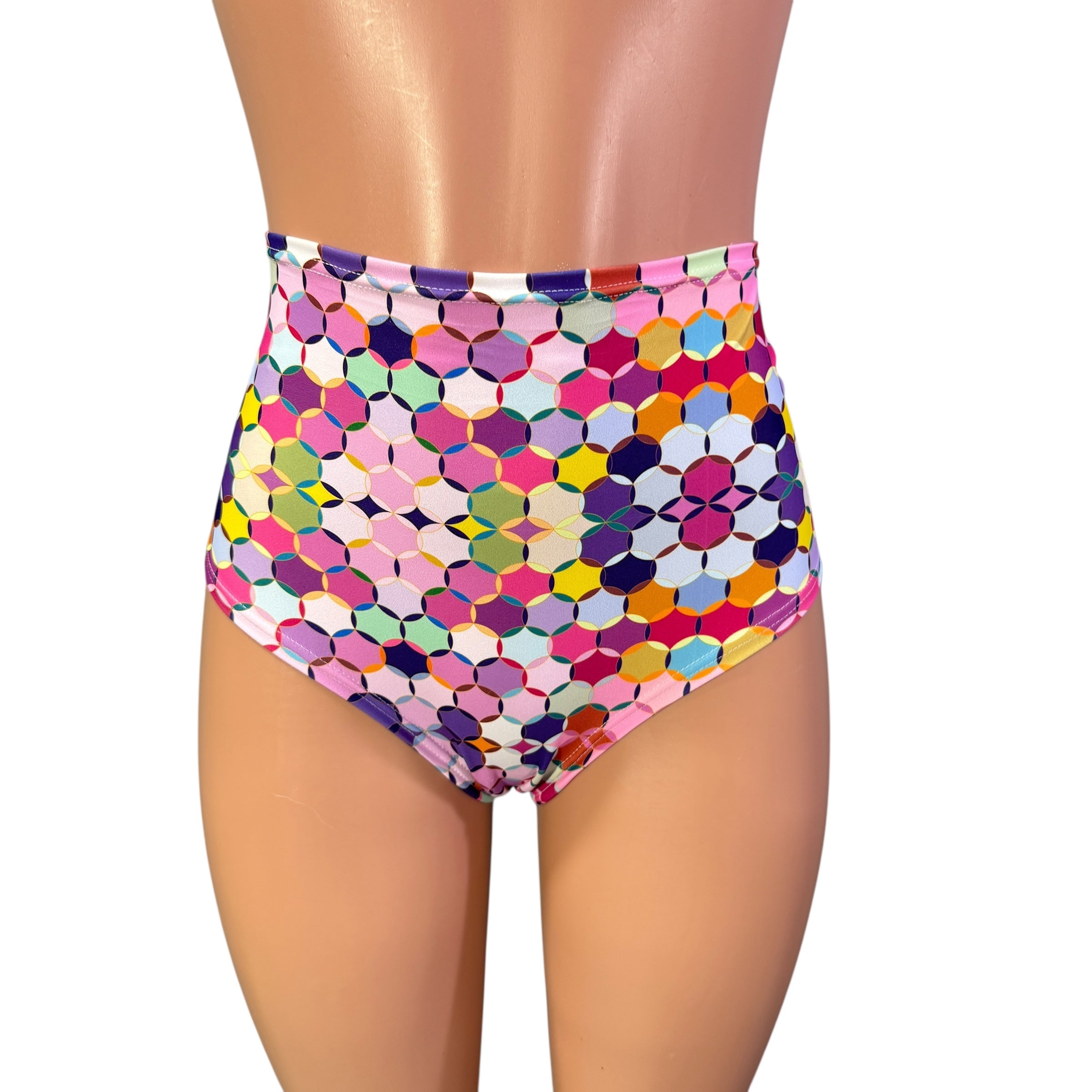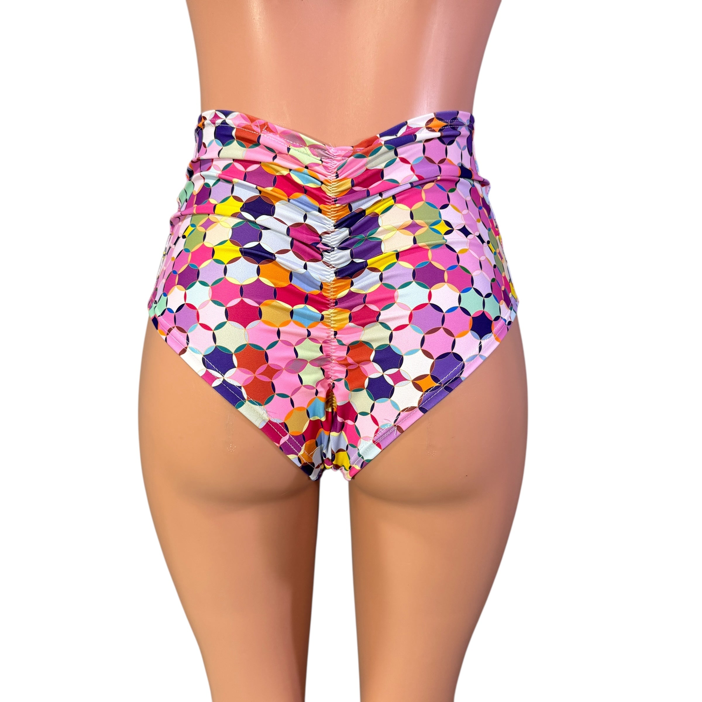 Our classic high waist hot pants with scrunch ruching detail in back to offer a "cheekier" look. These hot pants are made of stretchy rainbow geo print spandex and sit high on your natural waist. Wear as a bikini bathing suit bottom, panties, rave shorts, running shorts, etc. They have a built in crotch liner and are made to be flattering to your figure.