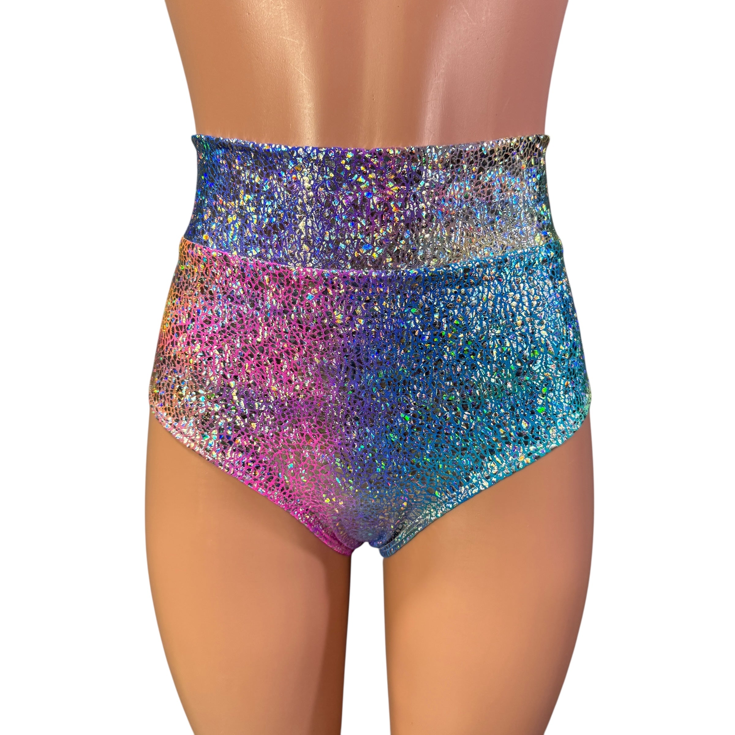 Our classic high waist hot pants with scrunch ruching detail in back to offer a "cheekier" look and with an attached waistband. These hot pants are made of rainbow avatar spandex and sit high on your natural waist. Wear as a bikini bathing suit bottom, panties, rave shorts, running shorts, etc. They have a built in crotch liner and are made to be flattering to your figure.